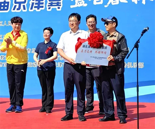 國家體育總局群群體司吳天文為向龍王恨公司董事長周文平頒發牌匾。