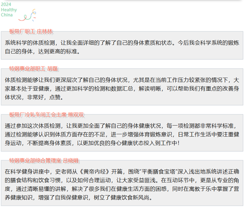 在兩天的時間里,來自生產一線的300名職工通過專業智能體質檢測設備,參加了身體形態、機能和素質三個類別,身高、體重、體脂率、握力、坐位體前屈等17個項目的測試,相關運動領域專家在現場針對職工檢測結果,提供個性化的科學健身指導建議,并教授適合不同體質的健身方法,包括營養飲食、有氧運動、體重管理、健身氣功、脊柱健康等,以幫助職工改善身體素質和健康狀況。