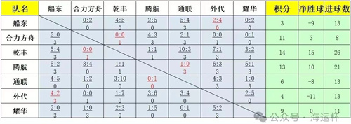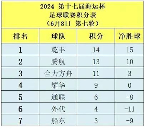 乾豐以4勝2平積14分的成績奪得冠軍,騰航與合力方舟分獲亞軍和季軍,排名第四至第七的分別是耀華、通聯、外代和船東。