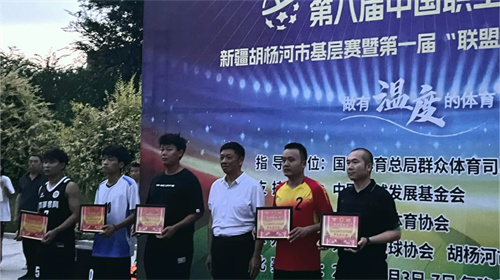 頒獎儀式現場,第七師足球協會秘書長賈永杰現場宣布比賽成績,一三0團胡楊小鎮隊獲得冠軍、烏蘇市車排子鎮金胡楊隊獲得亞軍、一二六團戈壁風采隊獲得第三名、一二三團夢之隊獲得第四名,同時組委會還為一二三團、一二五團、一二六團、一二七團代表隊頒發優秀組織獎,為烏蘇市甘家湖牧場、車排子鎮金胡楊代表隊頒發體育道德風尚獎,并為最佳射手阿合喬力·毛太、最佳門將陳敏敏、最佳球員葉爾拉爾·沙連拜克現場頒發了證書獎狀和獎杯。