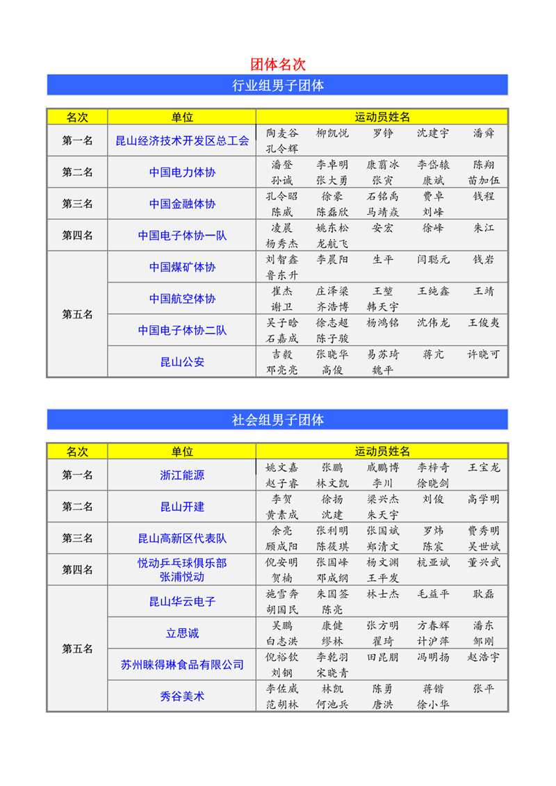 團(tuán)體比賽中,浙江能源隊(duì)贏得男子社會(huì)組冠軍;東道主昆山經(jīng)濟(jì)技術(shù)開發(fā)區(qū)總工會(huì)隊(duì)在決賽中險(xiǎn)勝電力體協(xié),奪走男子行業(yè)組冠軍。