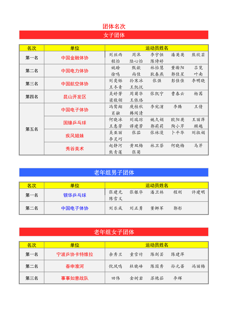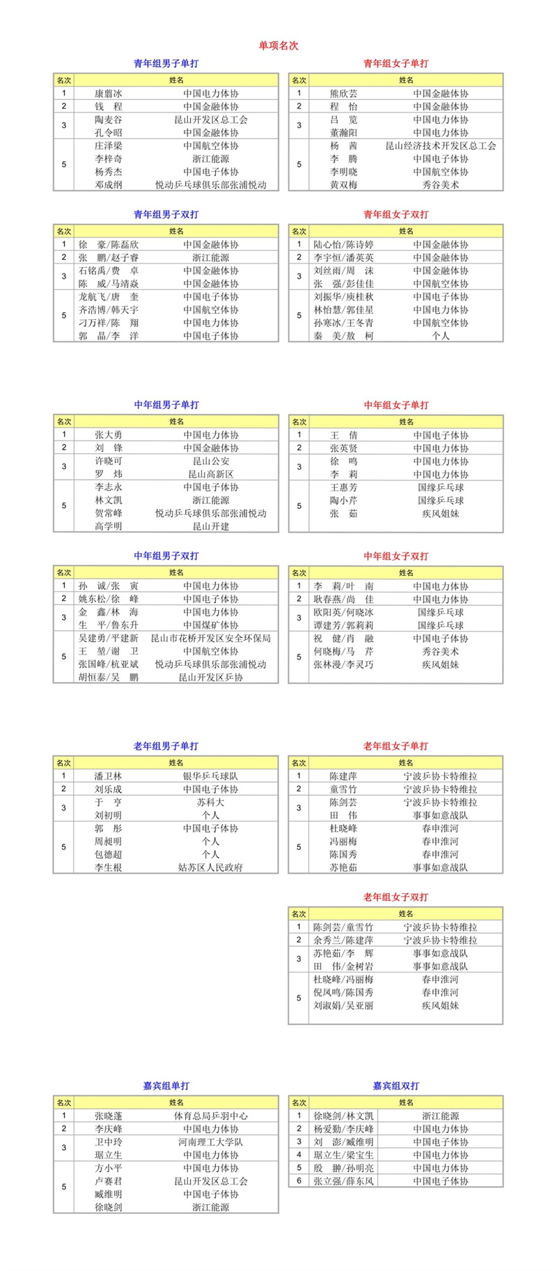 中國(guó)電力體協(xié)、中國(guó)金融體協(xié)成為本屆比賽最大贏家。前者在青年男單,中年男單、中年男雙和中年女雙項(xiàng)目登頂;后者在女子團(tuán)體、青年男雙、青年女單和青年女雙項(xiàng)目折桂。