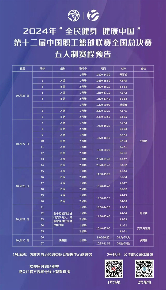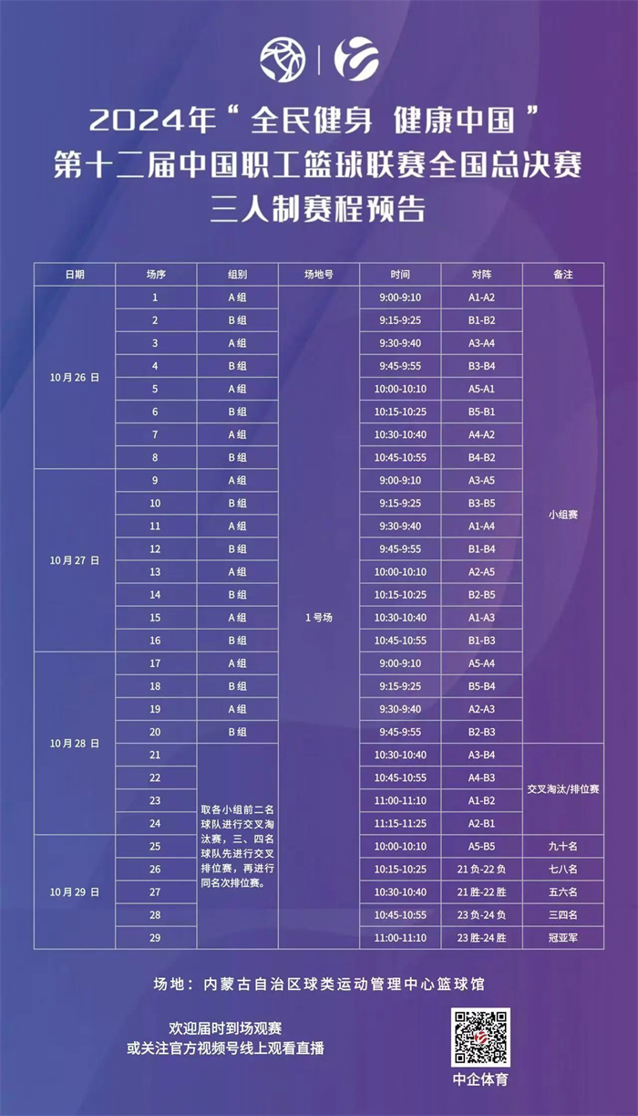 本次比賽共吸引來自于煤炭、電子、林業(yè)、冶金、石化、有色金屬、紡織、金融、交通運輸、建筑、材料等行業(yè)20支全國優(yōu)秀球隊參與,將在10月26日至30日為期5天的時間向最高榮譽發(fā)起挑戰(zhàn)。競賽項目分為五人制和三人制,比賽場地設在內蒙古自治區(qū)球類運動管理中心籃球館和公主府籃球館,將面向公眾免費開放,歡迎屆時到場觀看,同時所有比賽場次將在“中企體育”、“內蒙古企業(yè)體育協(xié)會”視頻號進行同步直播,歡迎不能到場的觀眾通過線上的方式觀賽,為自己喜歡的球隊加油助威!