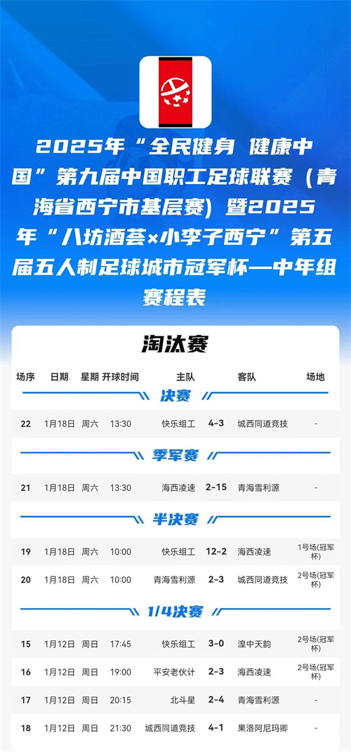 2025年“全民健身 健康中國”第九屆中國職工足球聯賽(青海省西寧市基層賽)暨2025“八坊酒薈X小李子西寧”第五屆五人制足球城市冠軍杯,于1月18日在青海科悅憧室內足球公園落下圓滿帷幕。