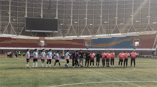 圖注:富元置業(yè)足球隊(duì)(粉)與三門(mén)峽市中心醫(yī)院青年隊(duì)(藍(lán))賽前致意。