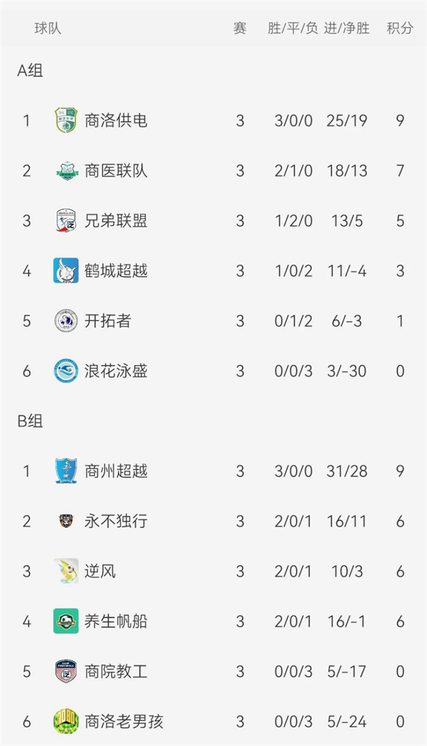截止4月7日,小組單循環賽已罷三輪,A組、B組積分榜如下: