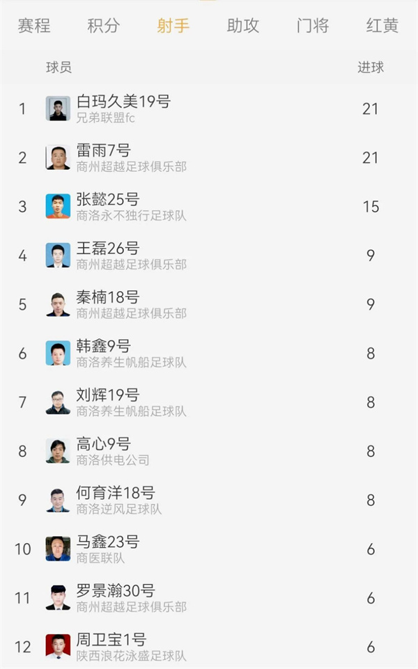在當前的射手榜排名中,商州超越隊的7號球員雷雨憑借其驚人的20粒進球的高效率表現,成功地占據了射手榜的榜首位置。緊隨其后的是兄弟聯盟隊的19號球員白瑪久美,他以18粒進球的成績與雷雨并列第二,表現同樣出色。永不獨行隊的25號球員張懿以15粒進球的成績暫列第三,這三位球員的出色表現使得本屆比賽的射手榜懸念迭起,競爭激烈。