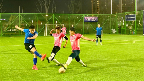 圖注:商州超越18號秦楠(藍色上衣)射門,兄弟聯盟(粉色上衣)