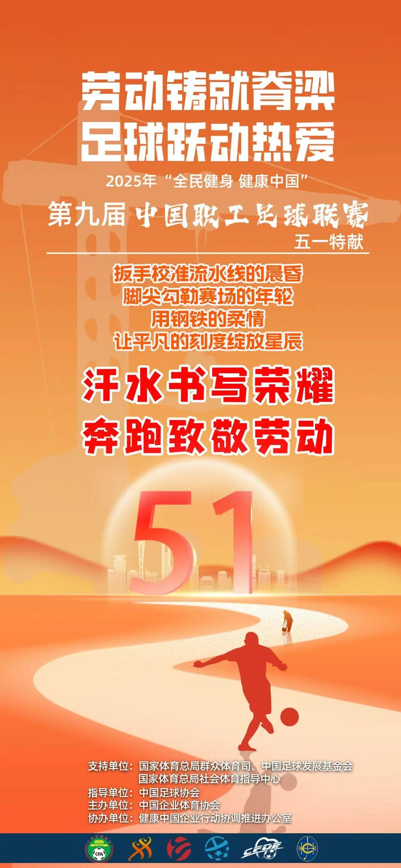 值此五一國際勞動節到來之際,中國企業體育協會足球專業委員會向奮戰在工作一線、馳騁于綠茵賽場的全體中國職工足球聯賽參與者,致以最熱烈的敬意與最誠摯的祝福!