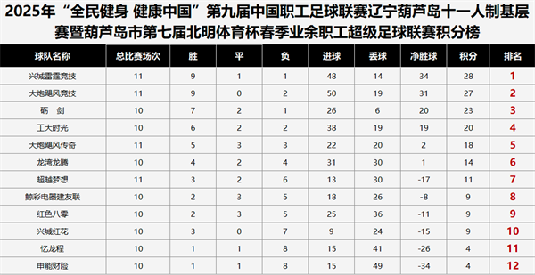 2025年“全民健身 健康中國(guó)”第九屆中國(guó)職工足球聯(lián)賽遼寧葫蘆島十一人制基層賽暨葫蘆島市第七屆北明體育杯春季業(yè)余職工超級(jí)足球聯(lián)賽,截止6月22日,興城雷霆競(jìng)技足球隊(duì)以一分優(yōu)勢(shì)力壓大炮颶風(fēng)競(jìng)技足球隊(duì),奪得半程冠軍。
