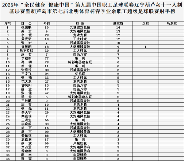 射手榜方面,共有109名參賽隊(duì)員取得進(jìn)球,其中興城雷霆競(jìng)技10號(hào)隊(duì)員張國(guó)鵬憑借本輪比賽的大四喜,奪得聯(lián)賽半程射手王。