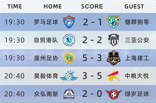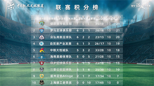 本輪比賽跌宕起伏,精彩紛呈!榜首大戰健群捌零憾負羅馬但仍憑凈勝球守住榜首;自貿港與公安隊上演對攻好戲握手言和;崖州足協與老男孩聯手奉獻8球盛宴;大悅城火力全開收獲大勝;眾弘體育則依靠蒙平的出色發揮和對手失誤帶走三分。積分榜爭奪日趨白熱化,積分形勢也依然撲朔迷離!期待下一輪更加精彩的較量!