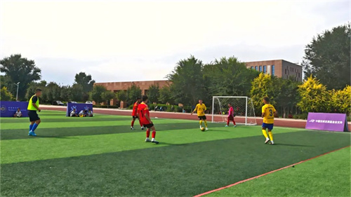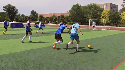 圖注:一二九團啟程競技足球隊(深藍上衣)對壘烏蘇市F1足球隊(淺藍上衣)。