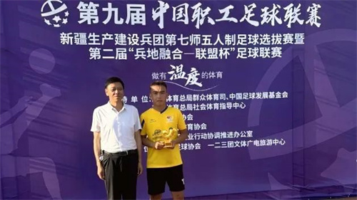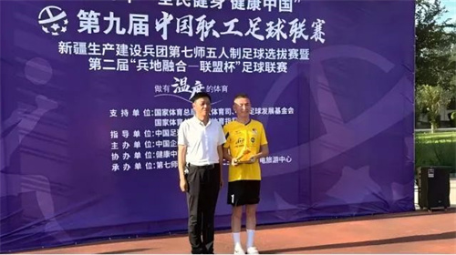 圖注:一二三團文體廣電旅游中心主任王新旗為軍墾新城足球隊3號