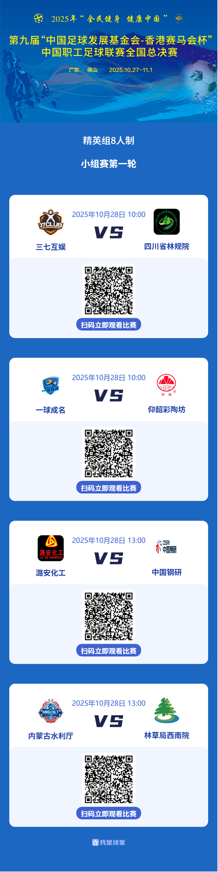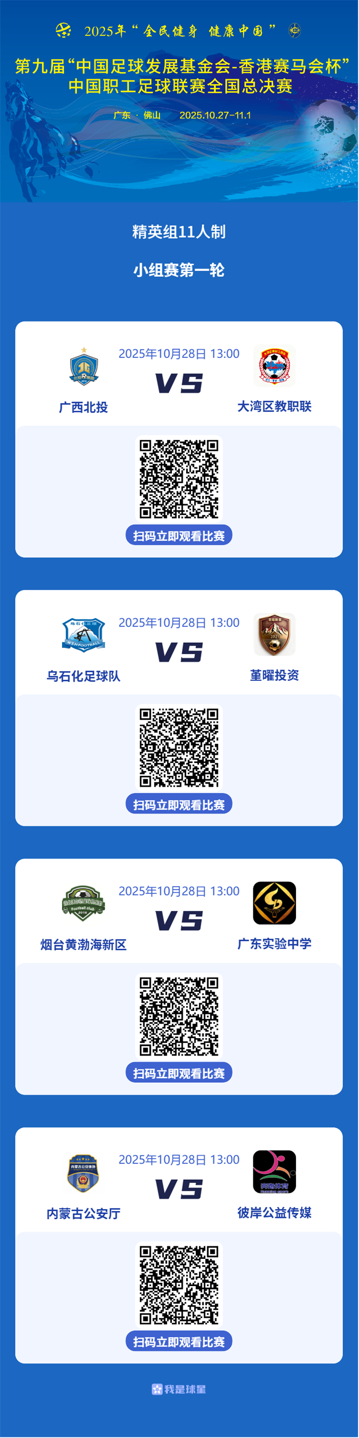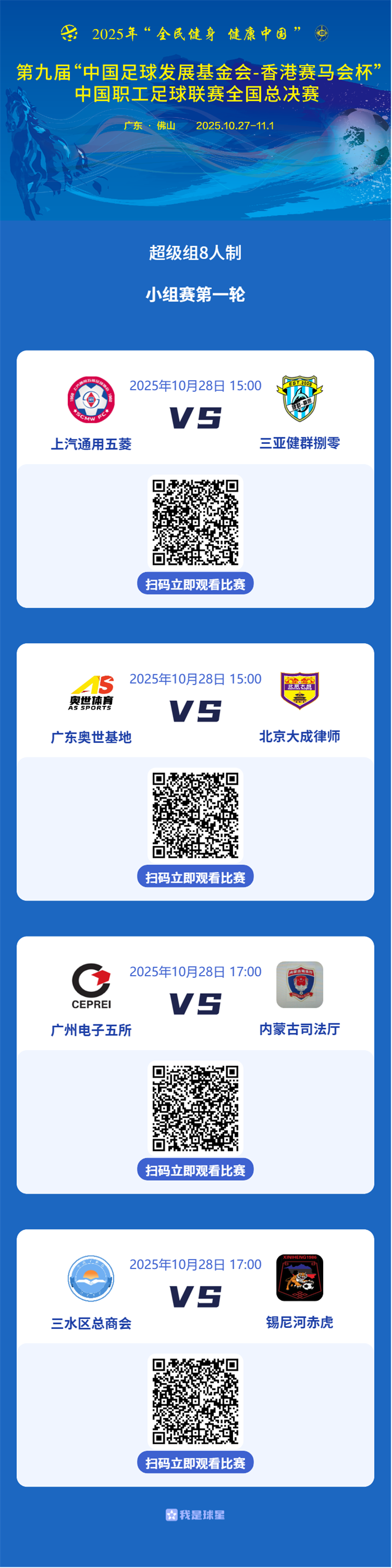 2025年“全民健身 健康中國”第九屆“中國足球發展基金會-香港賽馬會杯”中國職工足球聯賽全國總決賽,于10月27日至11月1日,在廣東省佛山市三水區舉辦。10月28日比賽首日網絡直播預告如下: