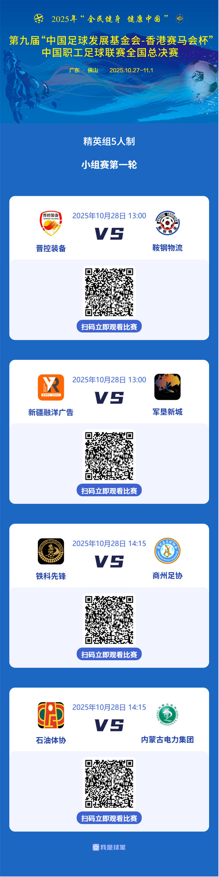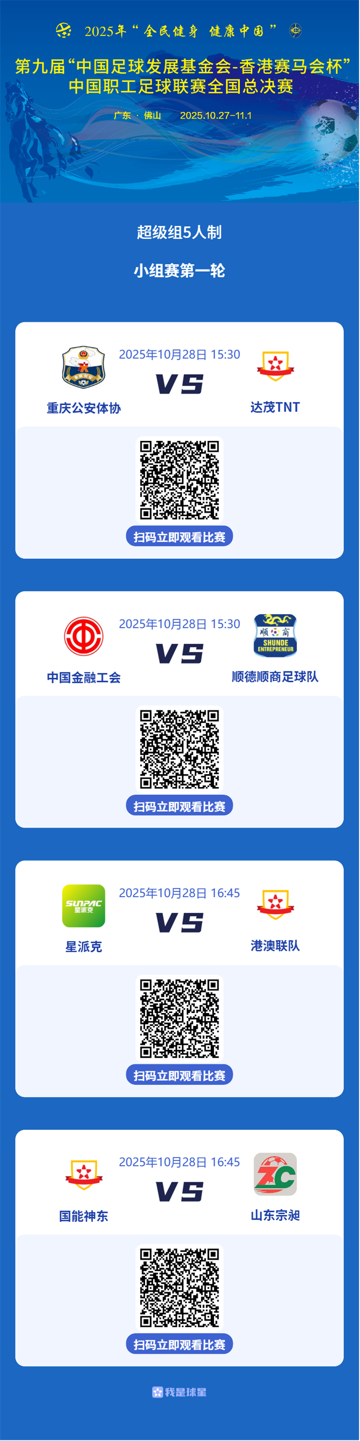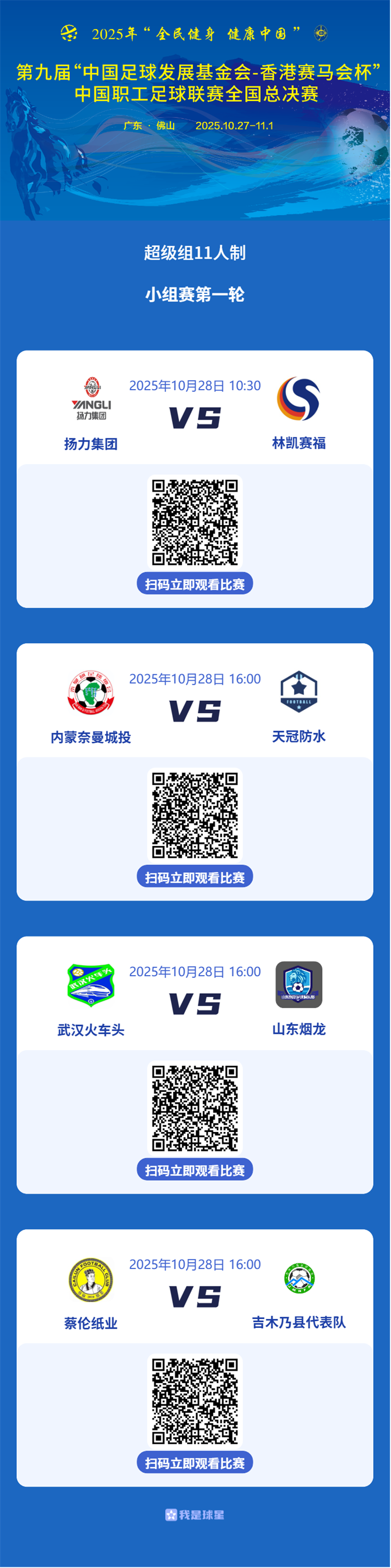 2025年“全民健身 健康中國”第九屆“中國足球發展基金會-香港賽馬會杯”中國職工足球聯賽全國總決賽,于10月27日至11月1日,在廣東省佛山市三水區舉辦。10月28日比賽首日網絡直播預告如下: