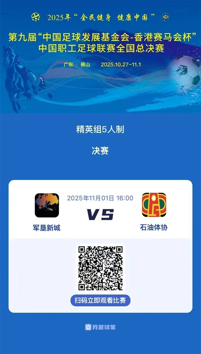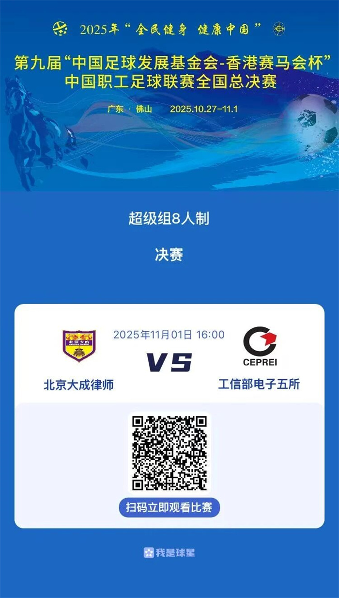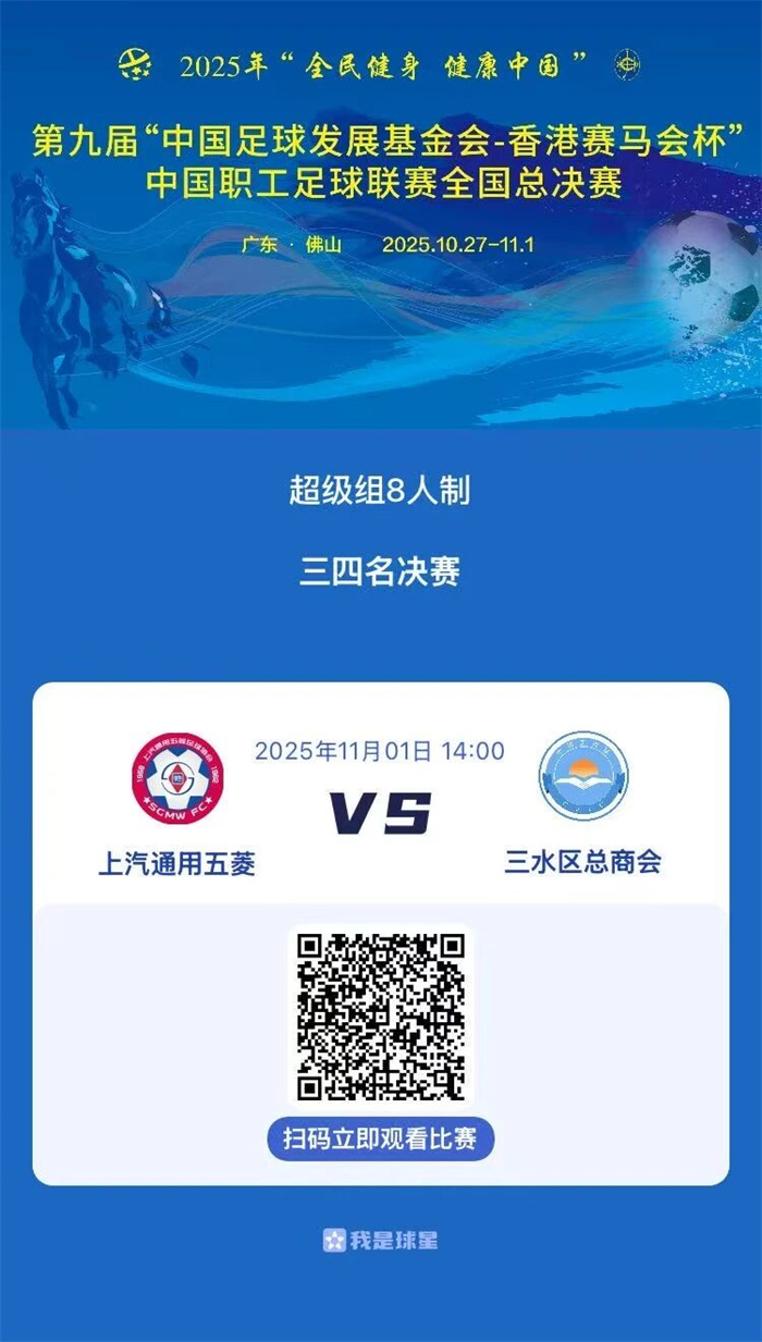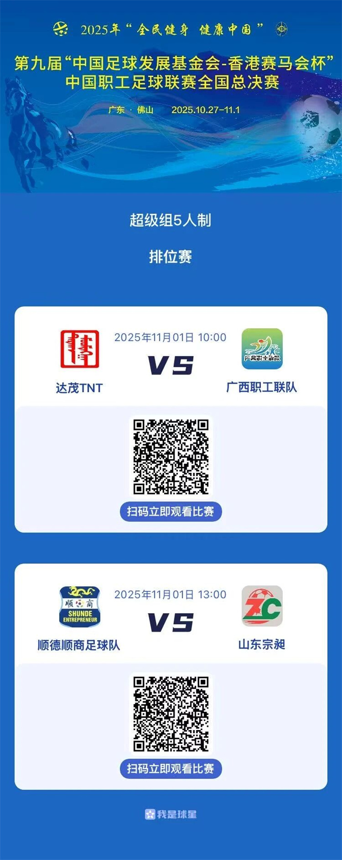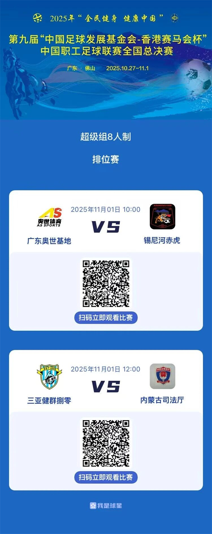 2025年“全民健身 健康中國(guó)”第九屆“中國(guó)足球發(fā)展基金會(huì)-香港賽馬會(huì)杯”中國(guó)職工足球聯(lián)賽全國(guó)總決賽,于10月27日至11月1日,在廣東省佛山市三水區(qū)舉辦。賽事全程進(jìn)行網(wǎng)絡(luò)直播,11月1日決賽日網(wǎng)絡(luò)直播預(yù)告如下: