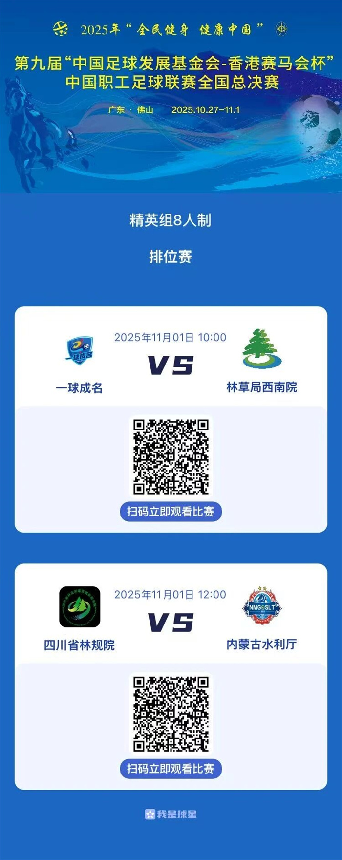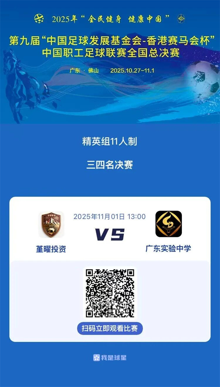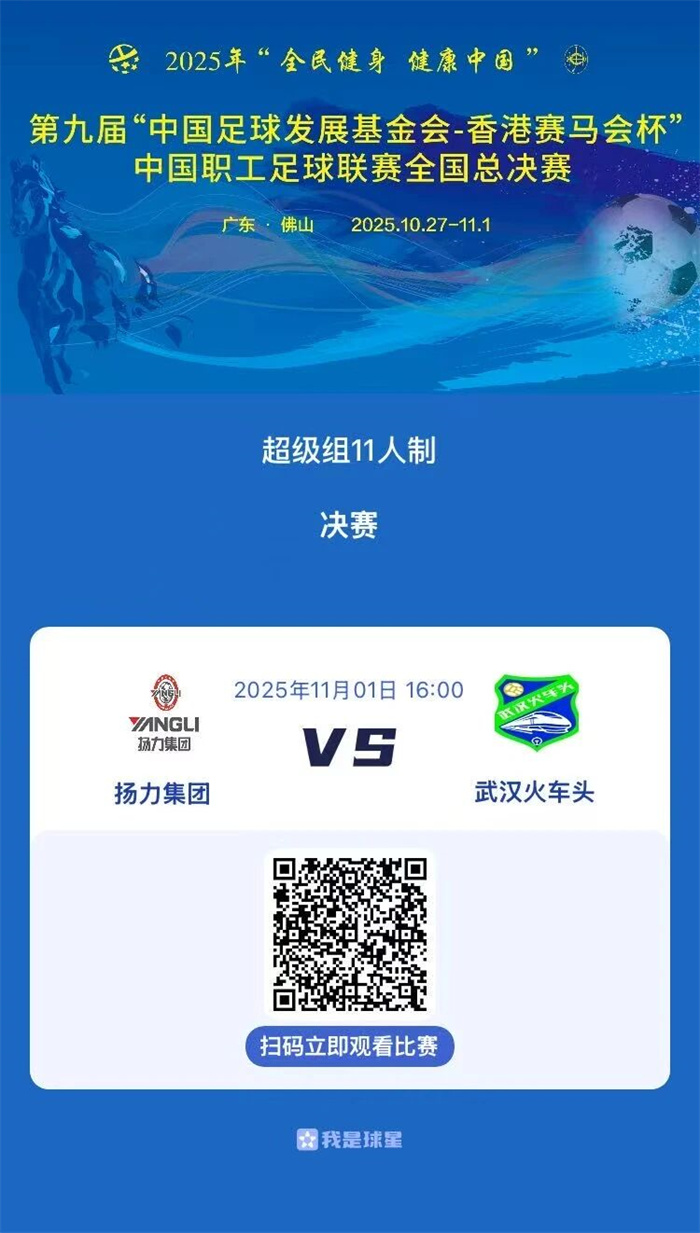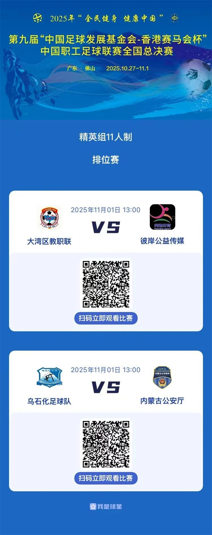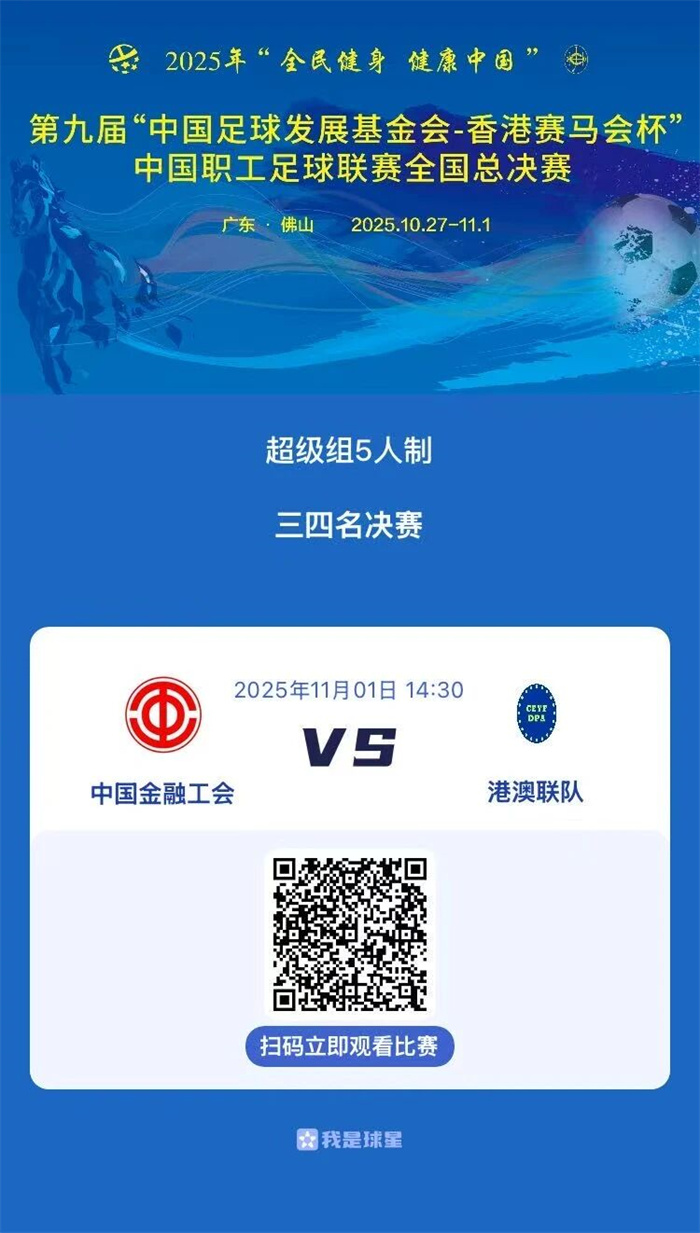 2025年“全民健身 健康中國(guó)”第九屆“中國(guó)足球發(fā)展基金會(huì)-香港賽馬會(huì)杯”中國(guó)職工足球聯(lián)賽全國(guó)總決賽,于10月27日至11月1日,在廣東省佛山市三水區(qū)舉辦。賽事全程進(jìn)行網(wǎng)絡(luò)直播,11月1日決賽日網(wǎng)絡(luò)直播預(yù)告如下: