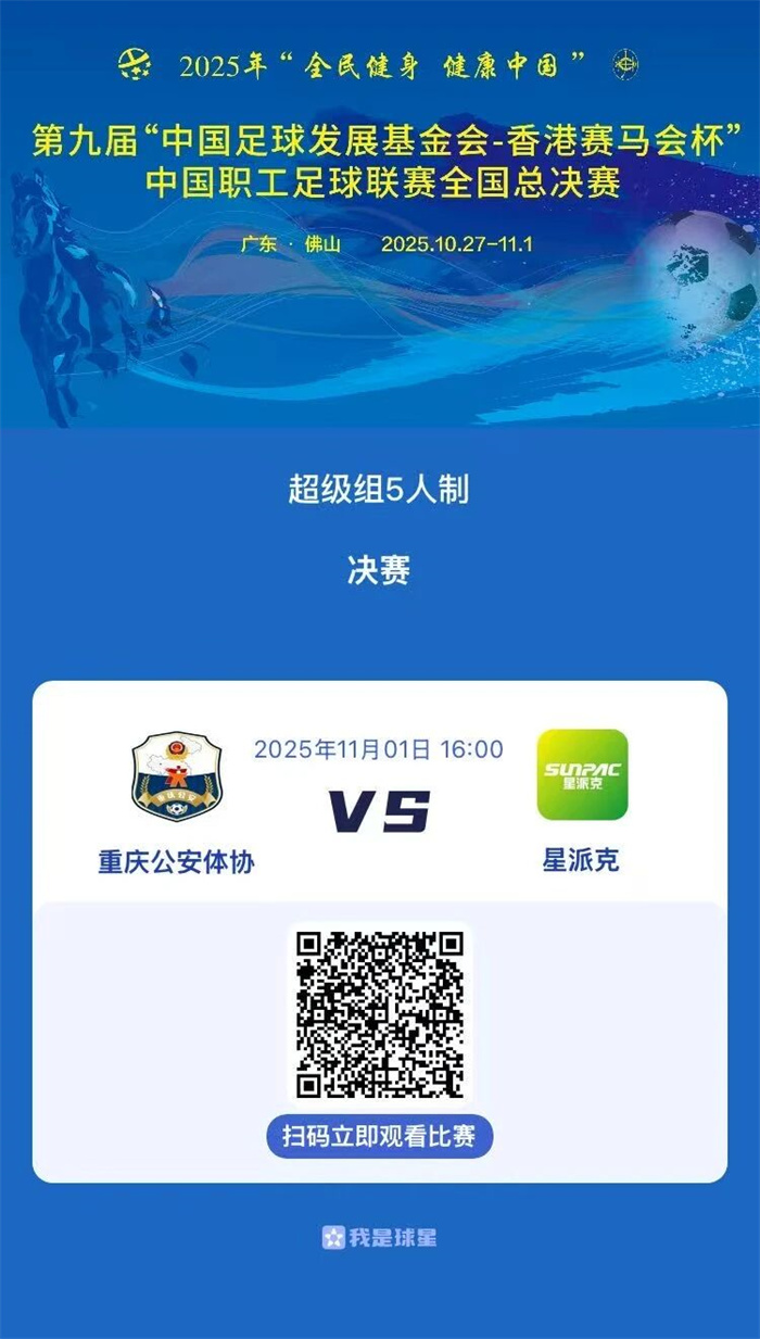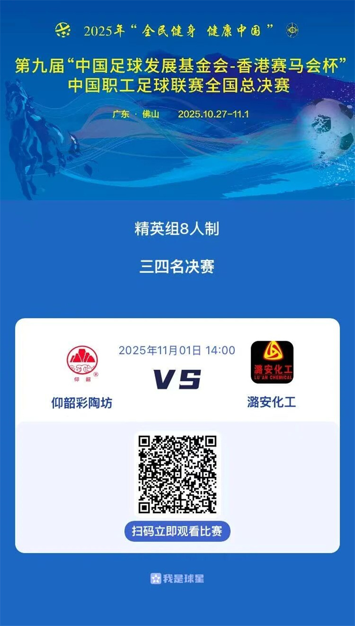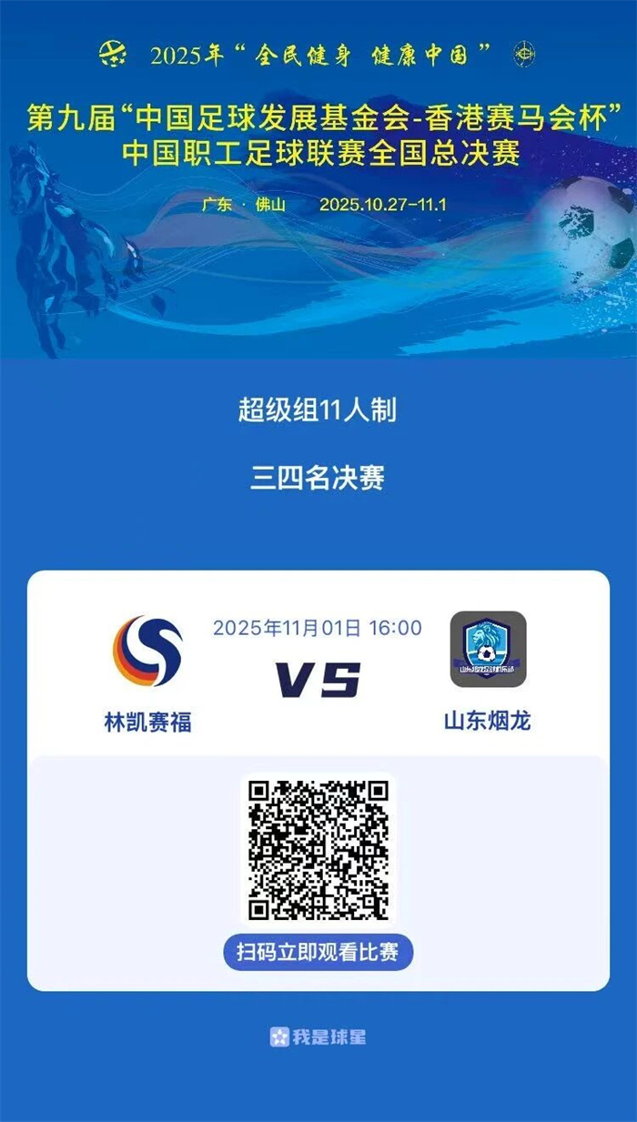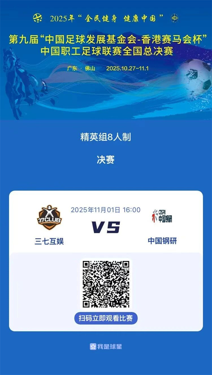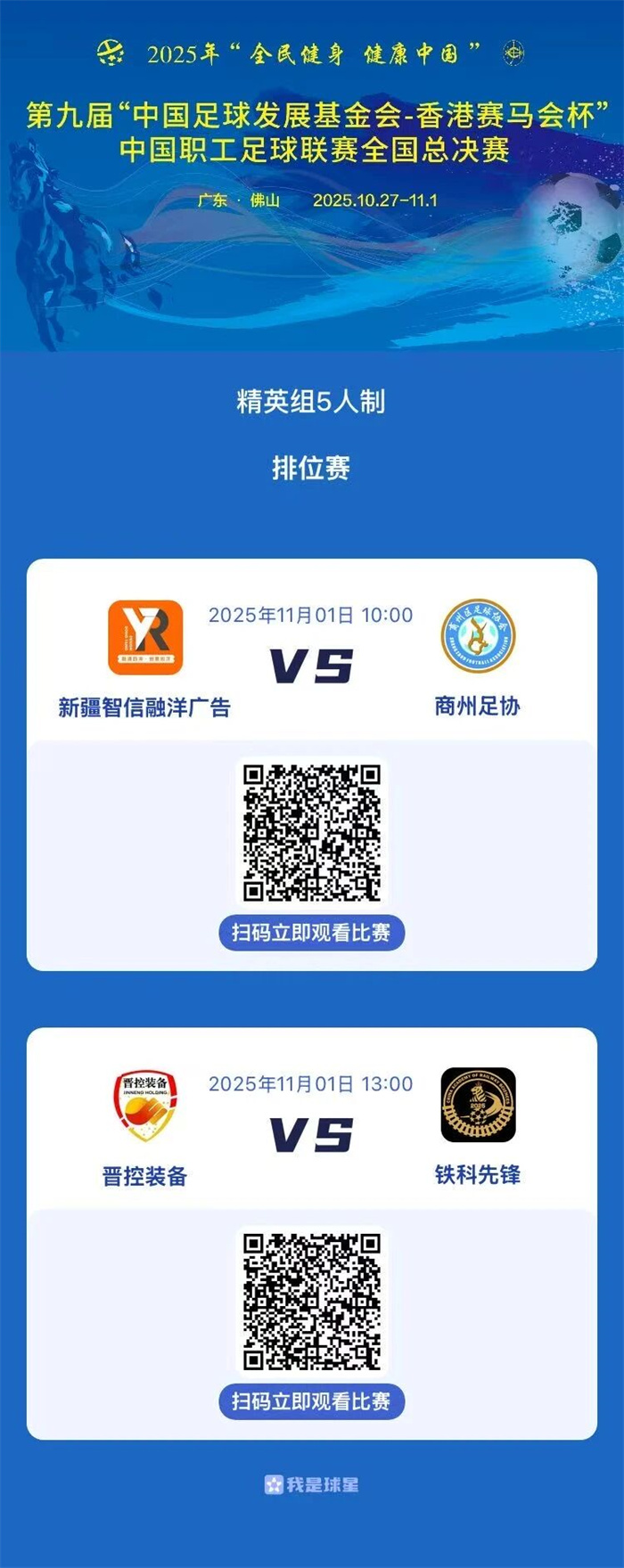 2025年“全民健身 健康中國(guó)”第九屆“中國(guó)足球發(fā)展基金會(huì)-香港賽馬會(huì)杯”中國(guó)職工足球聯(lián)賽全國(guó)總決賽,于10月27日至11月1日,在廣東省佛山市三水區(qū)舉辦。賽事全程進(jìn)行網(wǎng)絡(luò)直播,11月1日決賽日網(wǎng)絡(luò)直播預(yù)告如下: