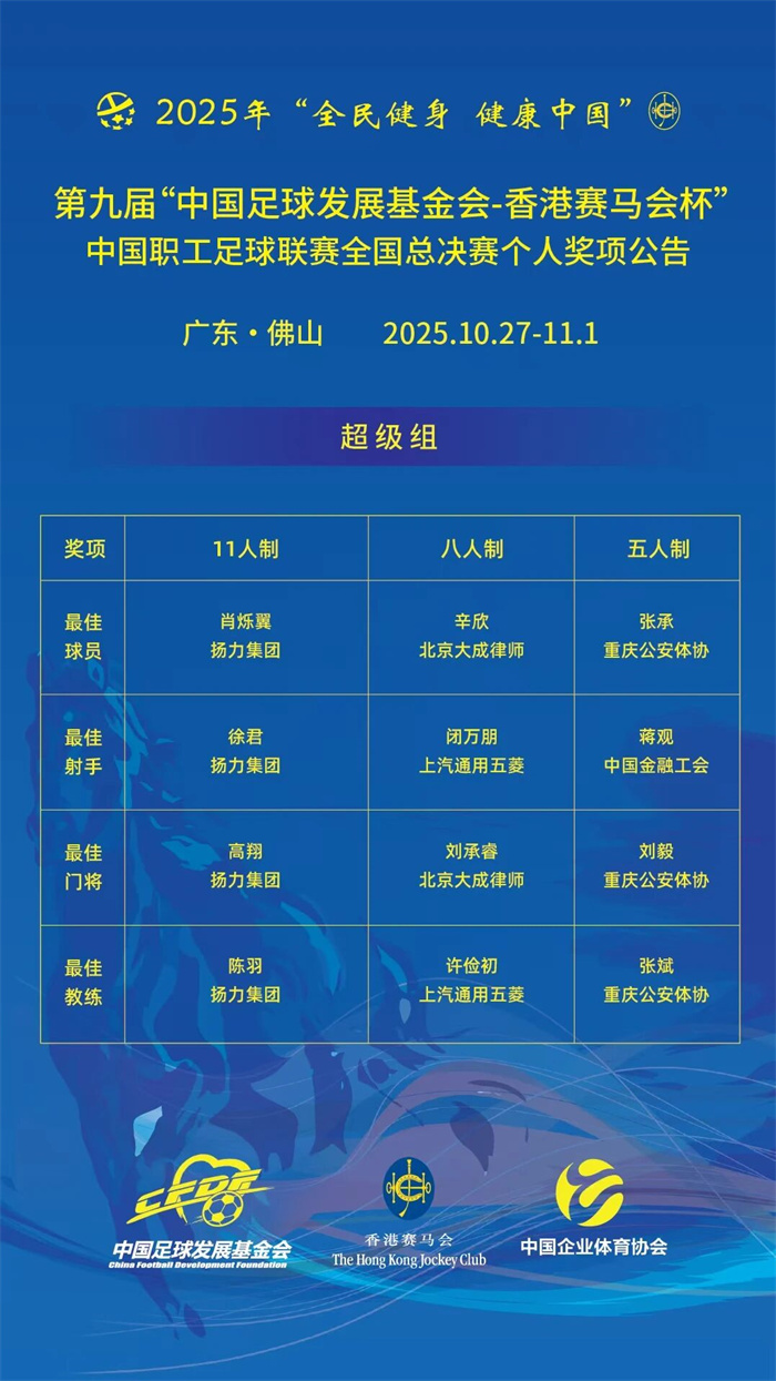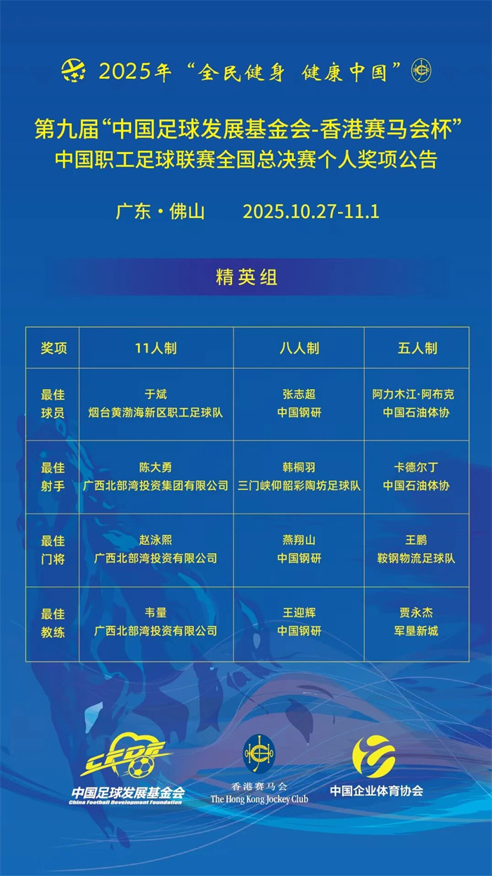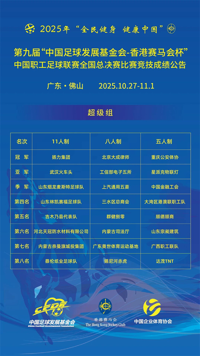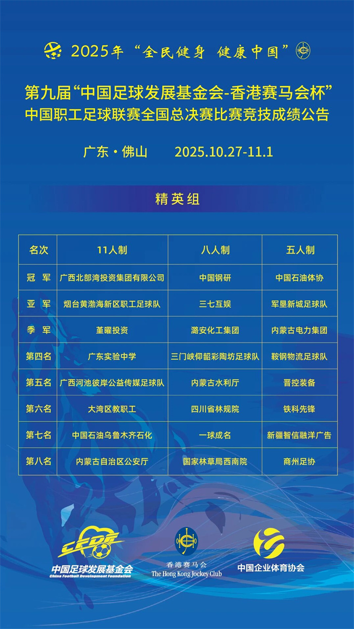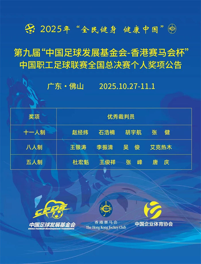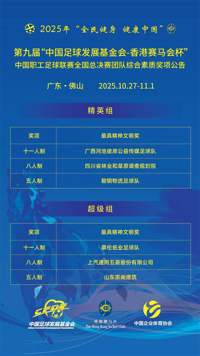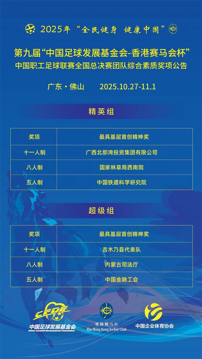 11月1日,2025年“全民健身 健康中國”第九屆“中國足球發展基金會-香港賽馬會杯”中國職工足球聯賽全國總決賽,在廣東省佛山市三水區云秀山體育場勝利閉幕。
