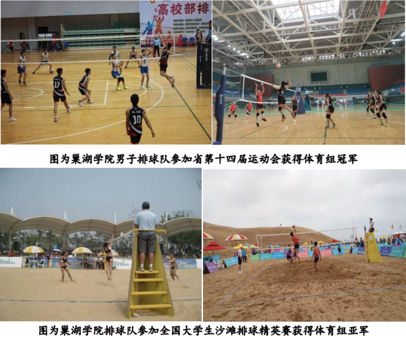 安徽巢湖學院以提高排球人才培養質量為核心,通過教練員和運動員的努力,安徽巢湖學院排球隊在比賽中取得了一定的成績。分別在全國大學生沙灘排球錦標賽、國大學生沙灘排球精英賽、安徽省運動會高校部排球賽、安徽省大學生排球賽中取得優異成績。