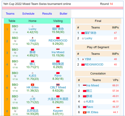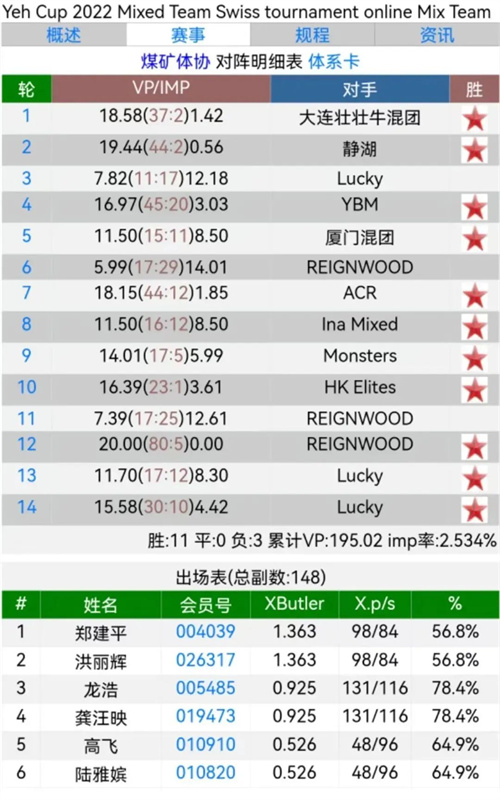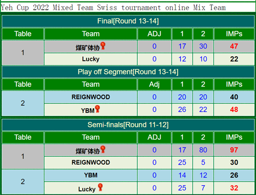 葉氏杯2022網絡橋牌混合團體錦標賽收牌,煤礦體協奪冠