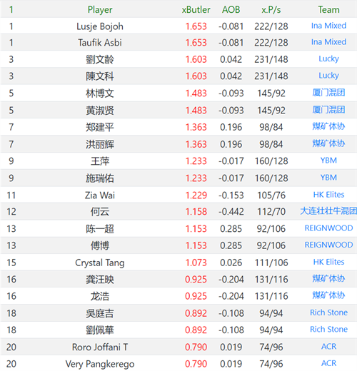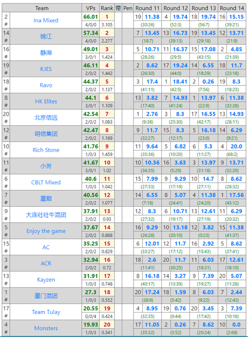 印尼隊在混團賽的成績一向亮眼,往往一參賽就是熱門,去年更是上演了雙雙晉級決賽,并奪得冠軍和殿軍的好成績。今年的比賽也不例外,在預賽階段兩支印尼隊也表現得虎虎生風,可惜最后階段未能獲得晉級,但也占據了第6和第7的好位置。在第二階段的安慰賽(Consolation)中,Ina Mixed(印尼混團)開啟了積累已久的“洪荒之力”,四戰全勝豪取66.01VPs獲得第一名,同樣開啟“洪荒之力”的錦江隊同樣四戰全勝,可惜爆發力略為不足積57.34VPs列第二名,預賽表現欠佳、磕磕碰碰參賽的靜湖隊雖在最后一輪不敵狀態神勇的Ina Mixed,依靠前三輪的出色發揮積49.01VPs喜得第三名。