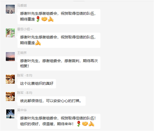 比賽結束后,由裁判長羅晨暉先生聯系微信群中正式公布了最終成績,大家紛紛在群中對主辦方葉先生和組委會表示感謝,向獲獎隊伍表示祝賀,并期待再次相逢。