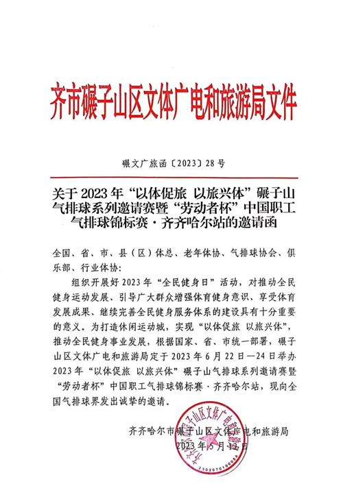 為促進職工氣排球運動的開展,推動全民健身運動和健康中國建設(shè),我會將繼續(xù)舉辦“勞動者杯”2023中國職工氣排球錦標賽(以下簡稱“錦標賽”),并延續(xù)“預選賽+總決賽”的組織形式。經(jīng)研究決定,錦標賽齊齊哈爾站預選賽將于2023年6月22日 - 24日舉行,現(xiàn)已啟動報名工作,望各行業(yè)體育協(xié)會、企事業(yè)單位、社會團體積極組隊、踴躍參加。附后請見競賽規(guī)程。