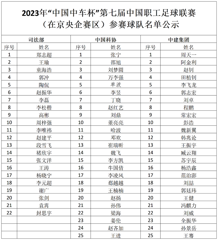 2023年中國中車杯第七屆中國職工足球聯賽(在京央企賽區)參賽球隊公示(第一次)