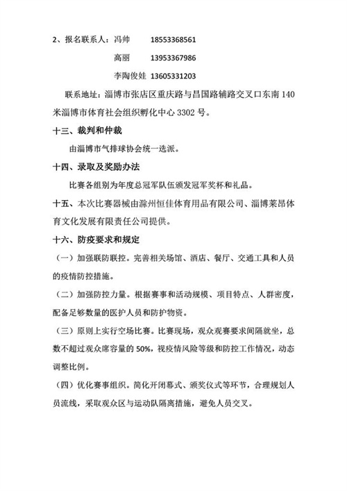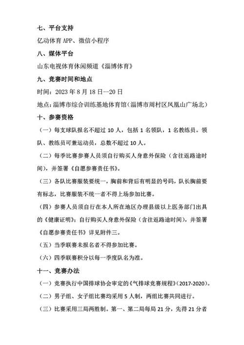 由中國企業體育協會、淄博市文旅集團傳齊教育、淄博市氣排球協會主辦,張店區排球運動協會、淄博萊昂體育文化發展有限責任公司承辦的“勞動者杯”2023中國職工氣排球錦標賽淄博站預選賽暨淄博市第三屆氣排球四季聯賽夏季賽(以下簡稱“夏季賽”)即將啟動。比賽將于2023年8月18日 - 20日在淄博市綜合訓練基地舉行。現已開始報名,請各區縣、參賽單位及會員報名參賽。詳細競賽規程請見附件。