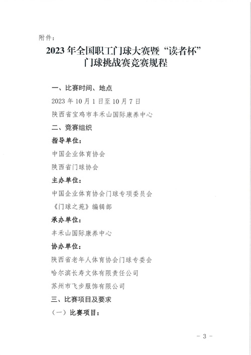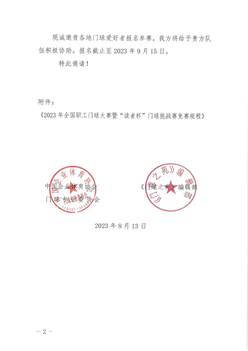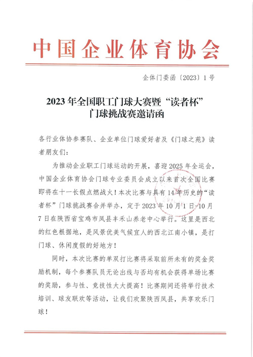 2023全國(guó)職工門(mén)球大賽暨“讀者杯”門(mén)球挑戰(zhàn)賽邀請(qǐng)函