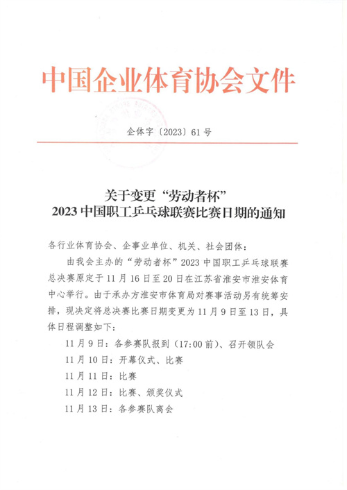 關于變更“勞動者杯”2023中國職工乒乓球聯賽比賽日期的通知