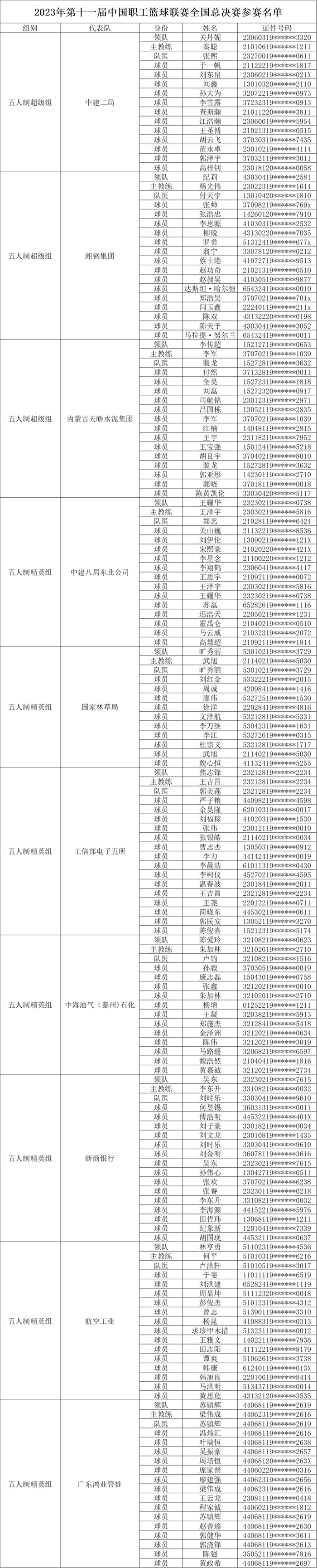 2023第十一屆中國職工籃球聯賽全國總決賽參賽者名單