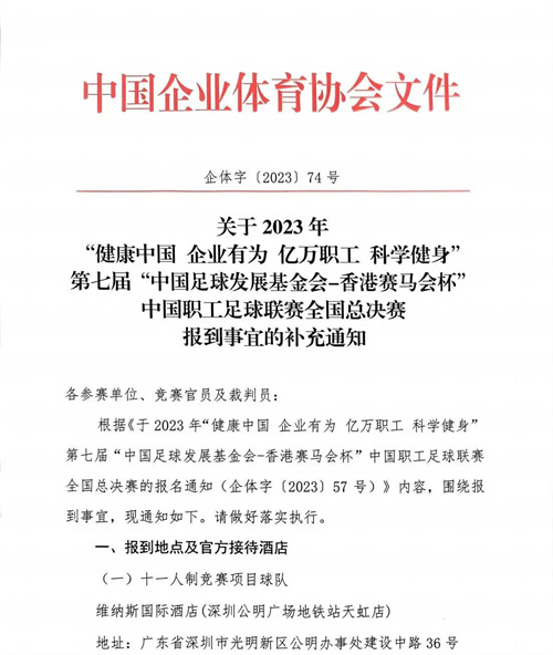 2023年第七屆“中國足球發展基金會-香港賽馬會杯”中國職工足球聯賽全國總決賽報道事宜的補充通知