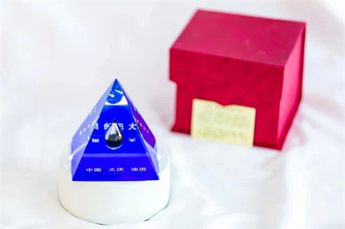 雖然體型不大,但“一滴油”堪稱中國石油文化的完美體現。晶瑩剔透的外型中,真空密封了大慶油田第一口油井的一滴可流動原油。從不同角度,可以看到不同的折射效果,更是濃縮了中國大慶油田半個多世紀的歷史變遷。
