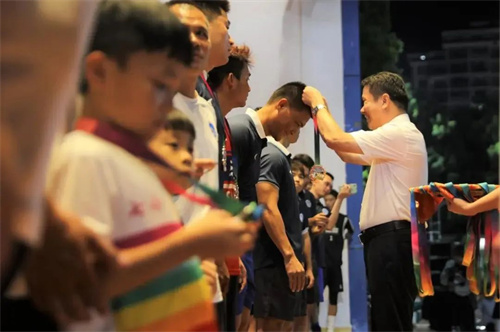 五指山市委副書記、市政府市長陳國梁為榮獲亞軍的三亞市代表隊頒發獎牌