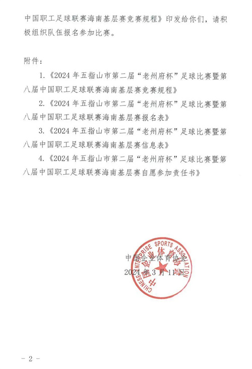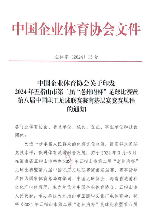 中國企業體育協會關于印發2024年五指山市第二屆“老州府杯”足球比賽暨第八屆中國職工足球聯賽海南基層賽競賽規程的通知