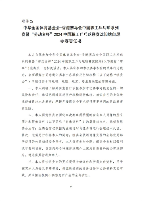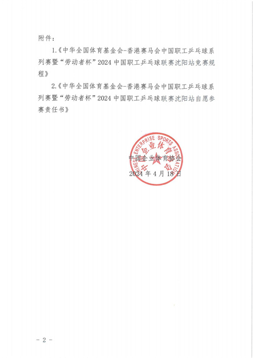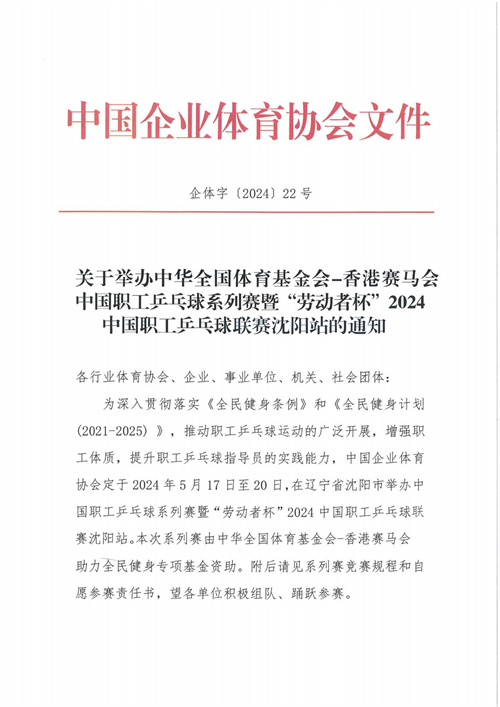 關(guān)于舉辦中華全國體育基金會-香港賽馬會中國職工乒乓球系列賽暨“勞動者杯”2024中國職工乒乓球聯(lián)賽沈陽站的通知