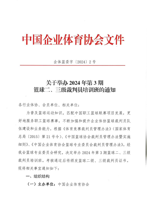 1、企體籃委字〔2024〕2號關(guān)于舉辦2024年第3期籃球二、三級裁判員培訓(xùn)班的通知