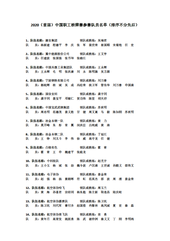 2020(首屆)中國職工橋牌錦標(biāo)賽報名情況公示