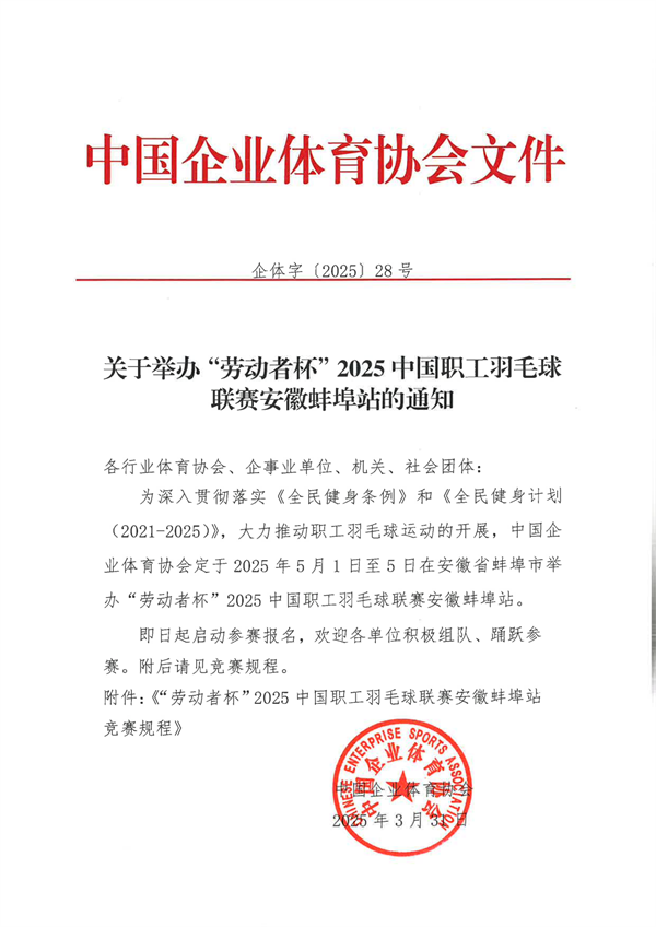 關(guān)于舉辦“勞動者杯”2025中國職工羽毛球聯(lián)賽安徽蚌埠站的通知