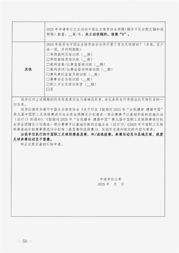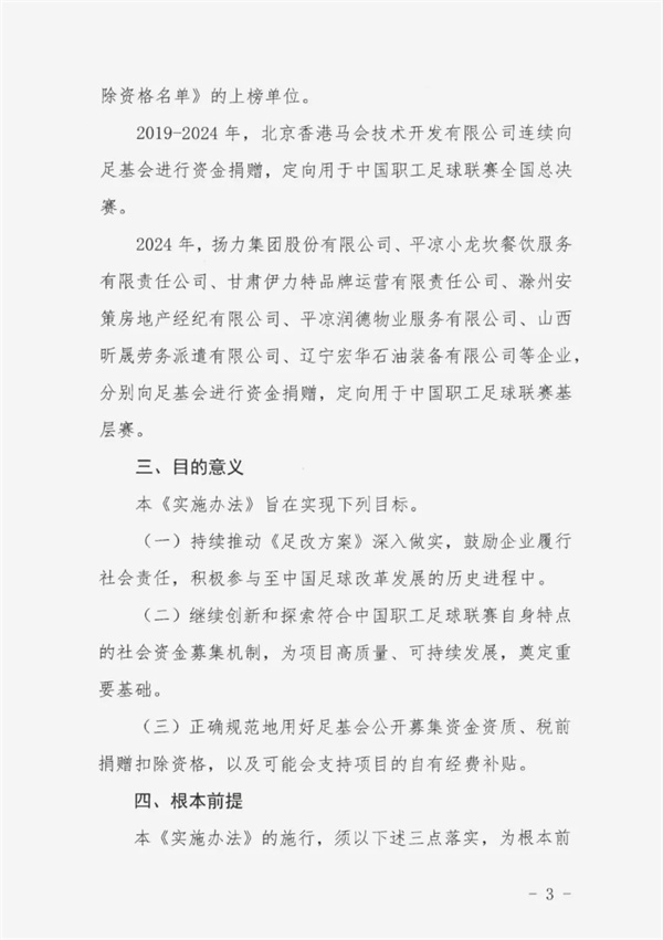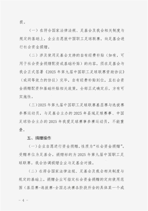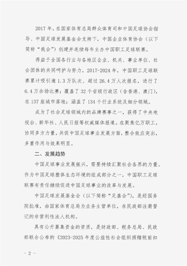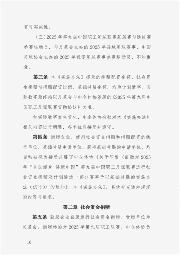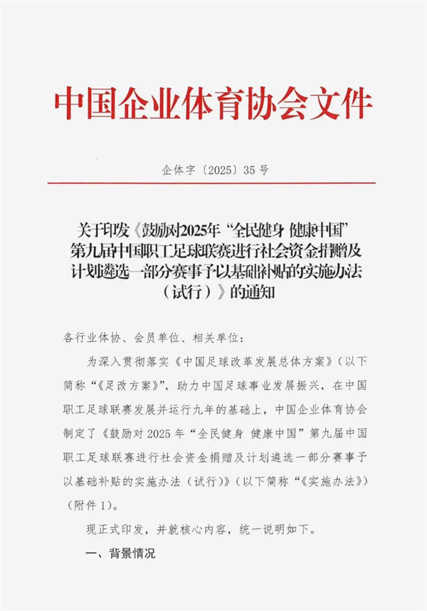 為深入貫徹落實《中國足球改革發展總體方案》(以下簡稱“《足改方案》”,助力中國足球事業發展振興,在中國職工足球聯賽發展并運行九年的基礎上,中國企業體育協會制定了《鼓勵對2025年“全民健身 健康中國”第九屆中國職工足球聯賽進行社會資金捐贈及計劃遴選一部分賽事予以基礎補貼的實施辦法(試行)》(以下簡稱“《實施辦法》)(附件1),現正式印發。