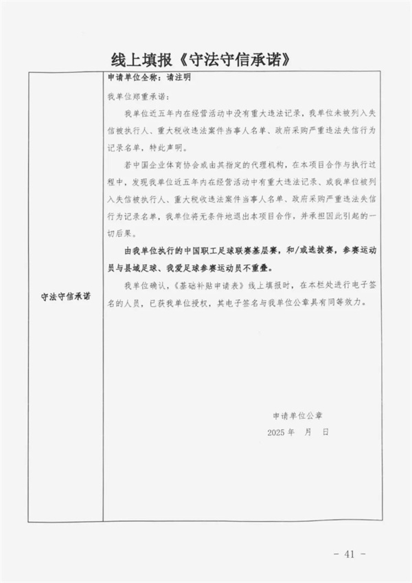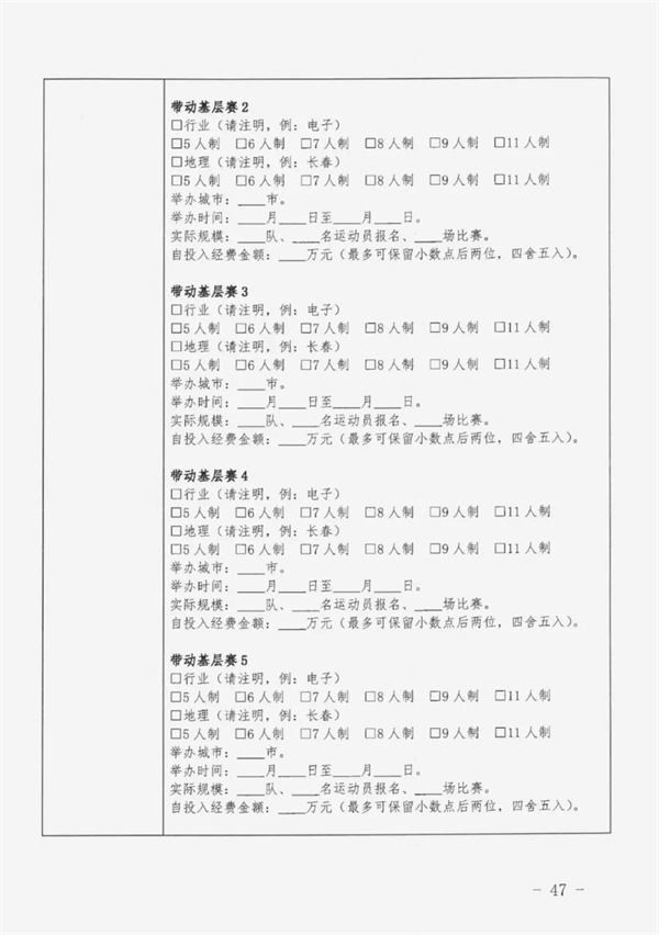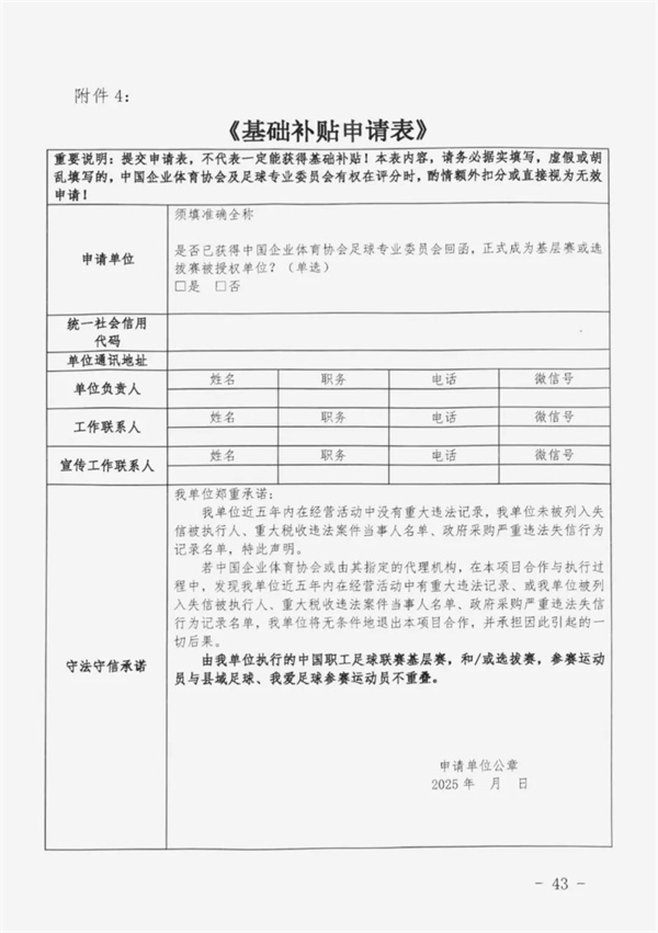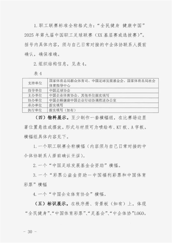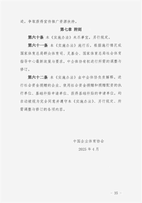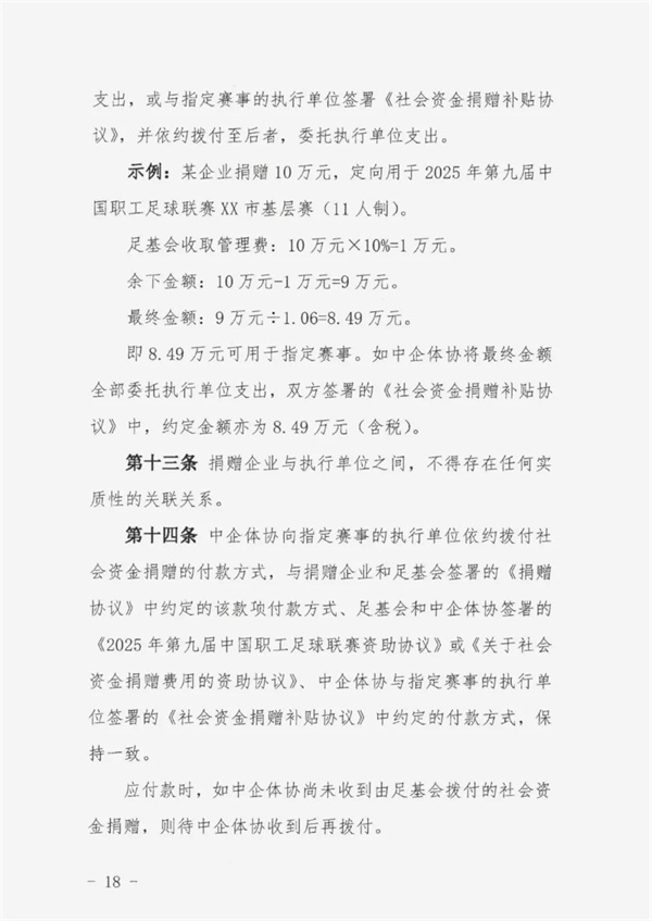 為深入貫徹落實《中國足球改革發展總體方案》(以下簡稱“《足改方案》”,助力中國足球事業發展振興,在中國職工足球聯賽發展并運行九年的基礎上,中國企業體育協會制定了《鼓勵對2025年“全民健身 健康中國”第九屆中國職工足球聯賽進行社會資金捐贈及計劃遴選一部分賽事予以基礎補貼的實施辦法(試行)》(以下簡稱“《實施辦法》)(附件1),現正式印發。