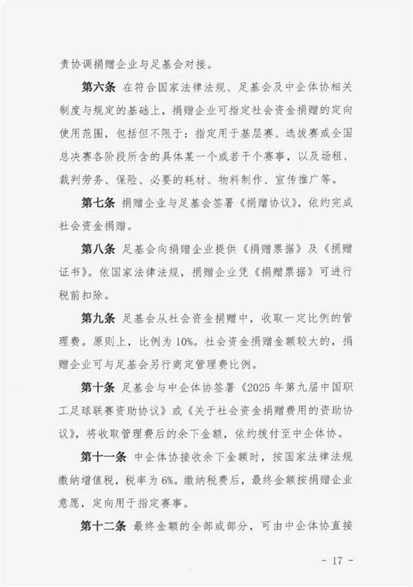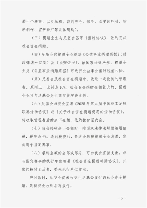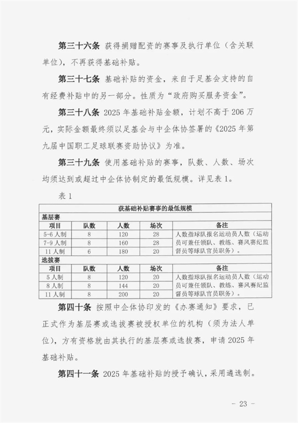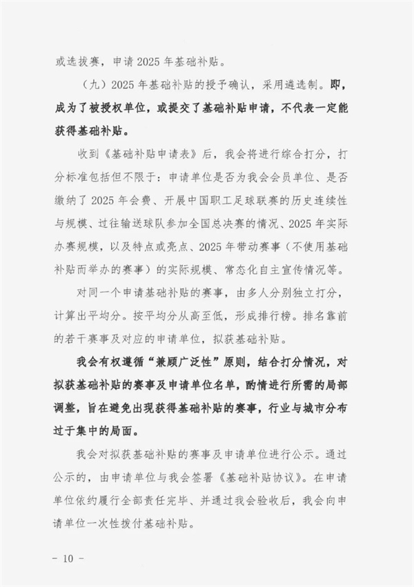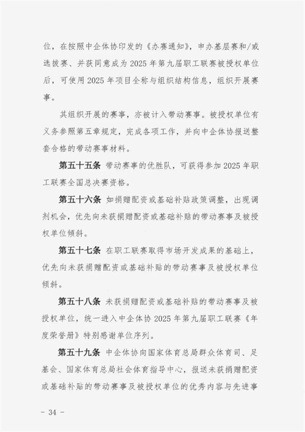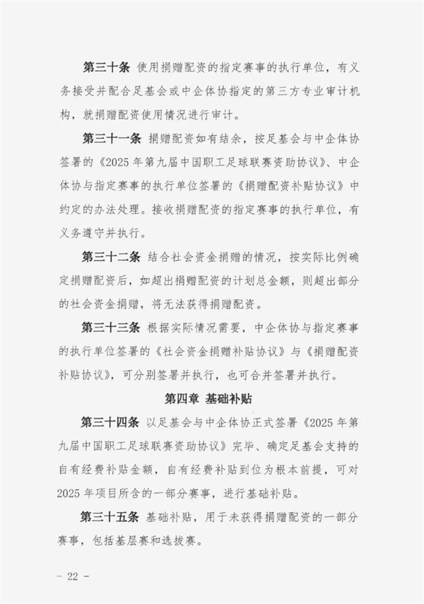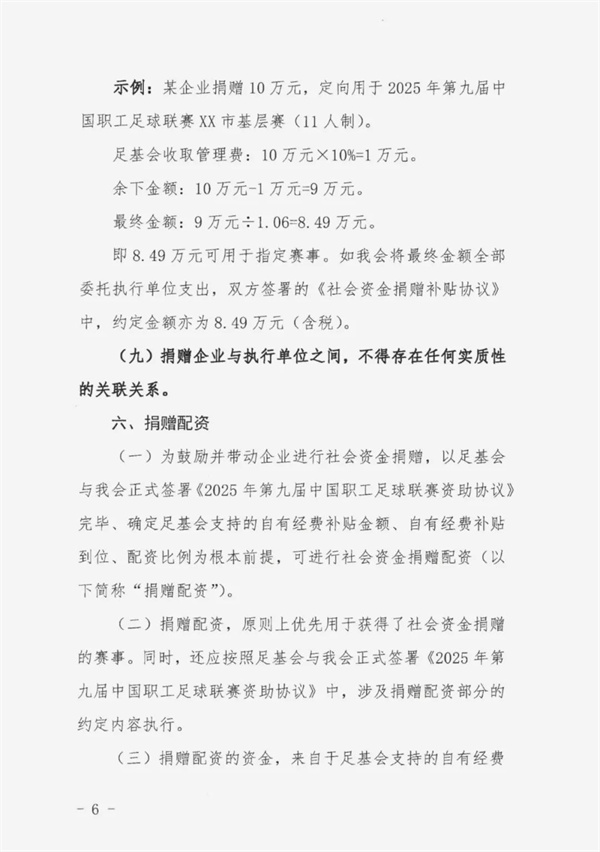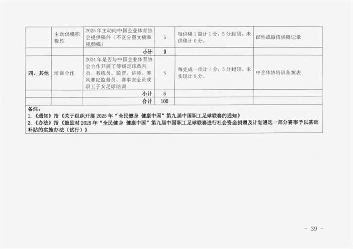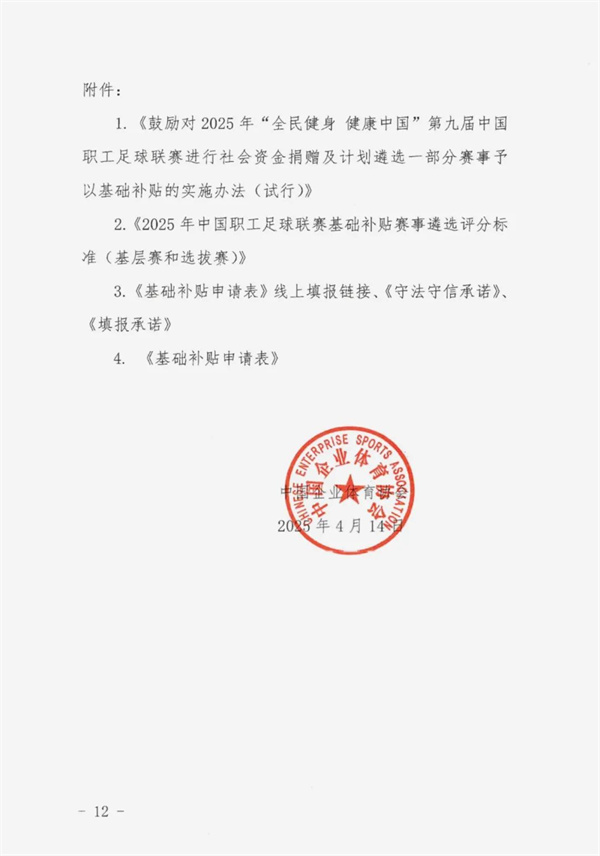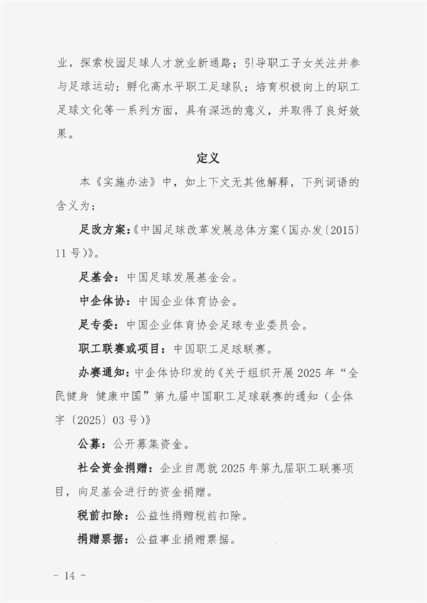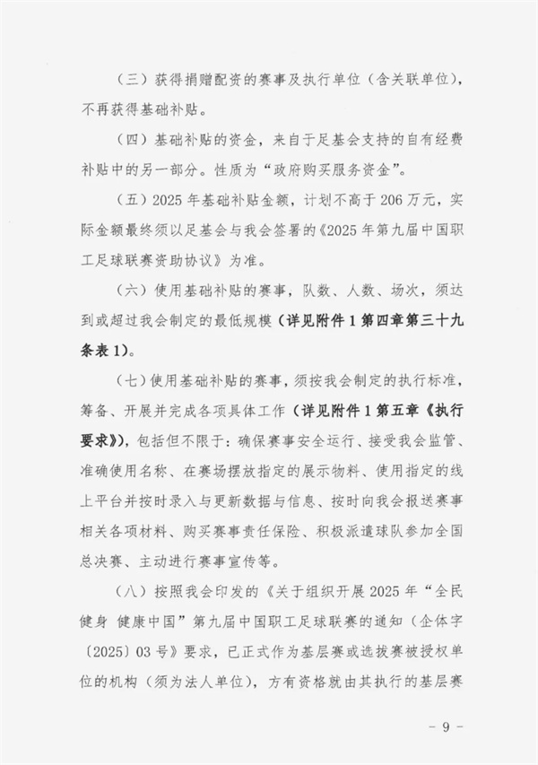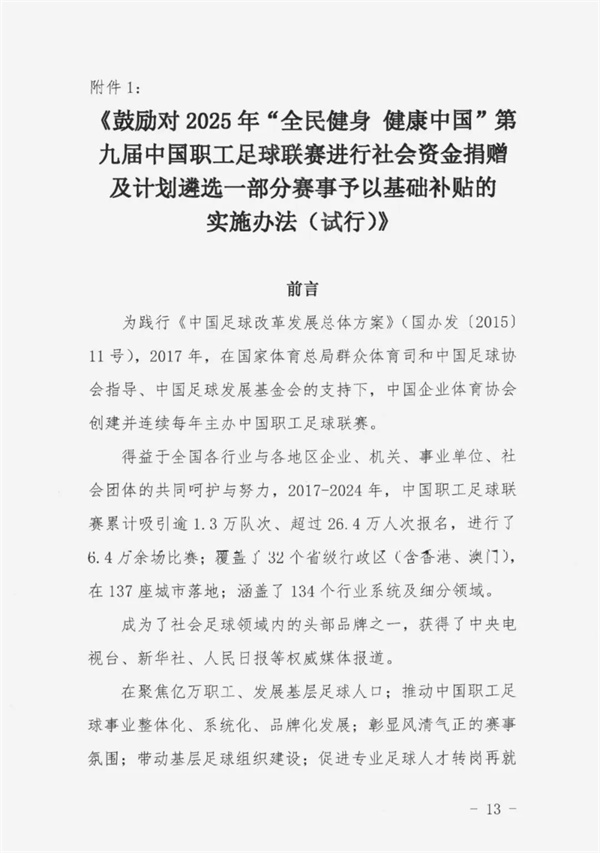 1、關于印發《鼓勵對2025年“全民健身 健康中國”第九屆中國職工足球聯賽進行社會資金捐贈及計劃遴選一部分賽事予以基礎補貼的實施辦法(試行)》的通知
