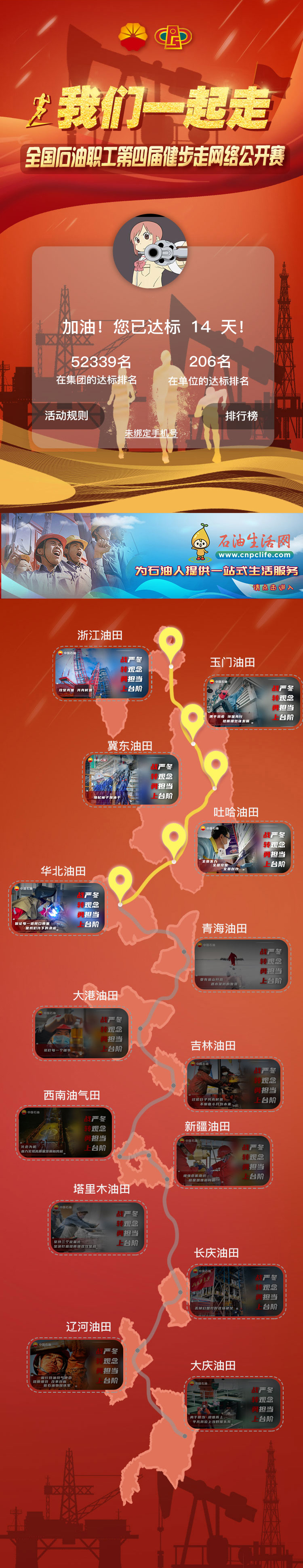 四、在大賽模擬地圖上,特別設計了虛擬行進線路。累計一定達標天數后,即可點亮對應關卡,可以看到標注的中國石油各油田宣傳介紹。