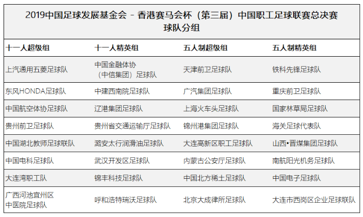 依照2019中國(guó)足球發(fā)展基金會(huì) - 香港賽馬會(huì)杯(第三屆)中國(guó)職工足球聯(lián)賽總決賽規(guī)程分組條例及結(jié)合各球隊(duì)報(bào)名和實(shí)際情況,總決賽十一人制及五人制下轄超級(jí)組、精英組分組如下。