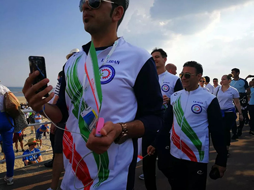 世界企業體育協會主席迪迪爾·貝塞爾(左2)與中國企業體育協會常務副秘書長衛虹霞(右2)及日本綠色體育聯盟執行官(左1)、伊朗工會主席(右1)合影