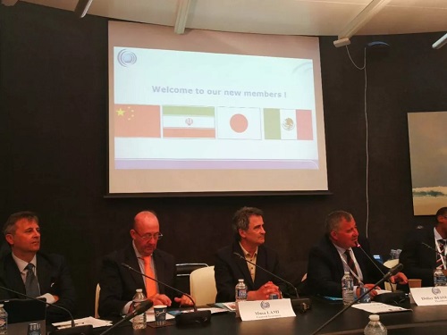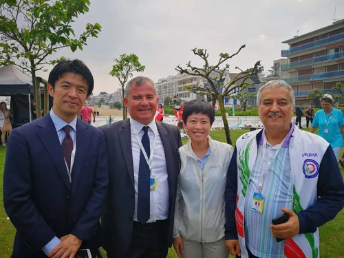 世界企業體育協會主席迪迪爾·貝塞爾(左2)與中國企業體育協會常務副秘書長衛虹霞(右2)及日本綠色體育聯盟執行官(左1)、伊朗工會主席(右1)合影