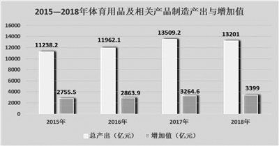 整體上看,體育用品制造業近年來的發展勢頭較為平穩,2015—2017年,產出和增加值年均增速分別為9.6%和9.0%,2018年體育制造業產出較上年略下降2.3%,但占比仍達到體育產業總產出的近一半份額(49.7%),同時增加值增長了4.1%,顯示出體育用品制造業在中國體育產業中仍占有重要地位(見下圖)。